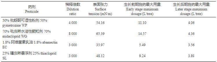 基于2.3節(jié)中表面張力與Rm值之間的關(guān)系,選取4種常用農(nóng)藥制劑(50%吡蚜酮可濕性粉劑、70%吡蟲啉水溶性顆粒劑、1.8%阿維菌素乳油和25%噻蟲嗪懸浮劑),測(cè)定其最大表面張力,結(jié)合果樹常用冠層參數(shù)(平均葉傾角、葉面積指數(shù)等)對(duì)果樹施藥用量進(jìn)行預(yù)測(cè)評(píng)估,從而為大容量果樹精準(zhǔn)用藥提供理論基礎(chǔ)。