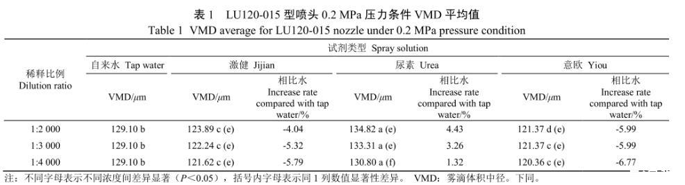 注:數(shù)字后不同字母表示同1行不同溶液間差異顯著(<0.05),括號(hào)內(nèi)字母表示同1列數(shù)值顯著性差異(<0.05)。VMD:霧滴體積中徑。下同。