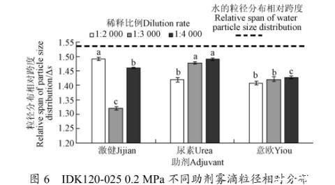 該試驗(yàn)條件下霧滴體積中徑相對(duì)分布如圖5所示,從圖中可以看出:加入助劑后,溶液的霧滴體積中徑均高于自來(lái)水,同時(shí)3種助劑溶液霧滴粒徑相對(duì)分布跨度Δs受溶液配比因素影響程度不同。該條件下自來(lái)水的粒徑分布相對(duì)跨度為1.344。激健溶液受影響程度最顯著,1:2 000配比條件下激健溶液粒徑分布相對(duì)跨度最大,粒徑分布相對(duì)跨度為1.469,相比于水增加9.29%,1:3 000配比條件下粒徑分布相對(duì)跨度為1.408,相比于水增大4.73%,相差近5%。意歐溶液受影響程度最小,1:3 000配比條件下意歐溶液粒徑分布相對(duì)跨度為1.365,相比水僅增加1.56%,1:4 000配比條件下相比于水增大2.31%,相差不足1%。尿素溶液在1:3 000配比條件下,粒徑分布相對(duì)跨度為1.429,相比于水增加6.33%,霧滴粒徑一致性減弱。