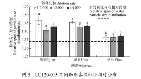 圖5 LU120-015不同助劑霧滴粒徑相對(duì)分布