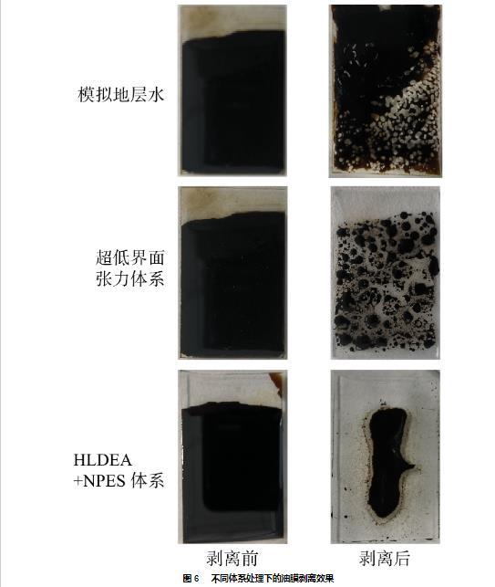 2)HLDEA+NPES體系可將油水界面張力降低至3.8×10?3 mN/m,水下油滴接觸角由41.34°增加至162.53°,使得24 h內(nèi)油膜剝離率高達75.3%。