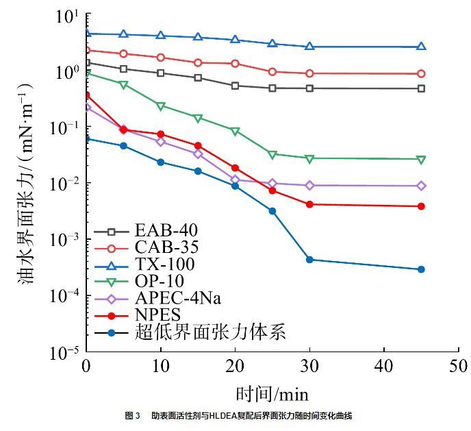 圖3助表面活性劑與HLDEA復(fù)配后界面張力隨時間變化曲線