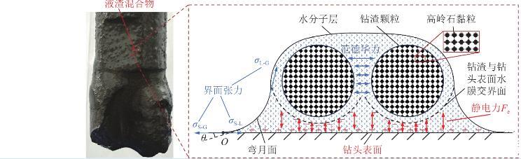式(1)表明,包裹鉆渣顆粒的“水膜”與鉆頭表面“水膜”形成的整體受彎月面處界面張力作用,被不斷沿鉆頭表面方向“拉扯”,使鉆渣顆粒被界面張力“綁縛”于鉆頭表面(圖3)。但僅依靠界面張力顯然無(wú)法抵抗鉆具高速旋轉(zhuǎn)產(chǎn)生的離心力,靜電力與界面張力的共同作用導(dǎo)致了泥化鉆渣黏附于鉆具表面,且靜電力對(duì)液渣混合物的黏附發(fā)揮了重要作用。