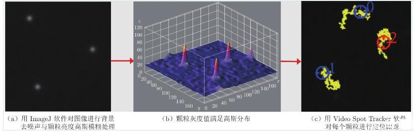 實驗采用Olympus顯微鏡(配備60倍物鏡)觀察顆粒在膜上的布朗運動,同時利用電子增益高速攝像機(Andor 897 EMCCD)進行拍攝。每個視頻拍攝時間為200 s,幀頻為0.05 s,曝光時間5 ms,圖像尺寸為300像素×300像素,分辨率為0.26μm/m。采集原始圖像中的顆粒灰度值不符合標(biāo)準(zhǔn)高斯分布,因此使用圖像處理軟件ImageJ對圖像進行背景去噪聲(Background Subtraction)和高斯模糊(Gauss-ian Blur)處理(圖3(a)),使顆粒灰度值達到標(biāo)準(zhǔn)高斯分布(圖3(b))。之后用Video Spot Tracker軟件定位每個顆粒的灰度峰值(圖3(c)),即顆粒質(zhì)心,定位誤差僅為0.5像素,進而對顆粒二維運動軌跡(平面)進行實時跟蹤。軟件自動將顆粒在每一時刻的像素位置坐標(biāo)存入計算機中,使用MATLAB計算顆粒在不同時間間隔Δt內(nèi)沿和方向的位移,計算公式如下: