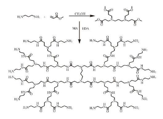 以1,3-丙二胺為反應(yīng)中心核,丙烯酸甲酯和乙二胺為支鏈,通過(guò)“一鍋法”合成h-PAMAM。具體的反應(yīng)過(guò)程可以分為以下幾步,首先將30 mL甲醇加入到三口燒瓶中,向其中加入1,3-丙二胺(0.1 mol),邊攪拌邊滴加丙烯酸甲酯(0.4 mol),隨后混合物在25℃下繼續(xù)攪拌反應(yīng)24 h。然后依次將乙二胺(0.28 mol)和丙烯酸甲酯(0.24 mol)滴加入燒瓶中,繼續(xù)反應(yīng)24 h。最后,在真空狀態(tài)下采用程序升溫:60℃反應(yīng)1 h,80℃反應(yīng)1 h,100℃反應(yīng)2 h,120℃反應(yīng)2 h,140℃反應(yīng)2 h。最終得到淺綠色、高黏度的樣品。合成路線如圖1所示。