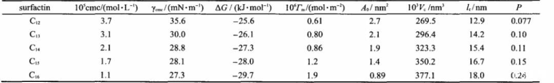 由一系列表面活性素溶液表面和界面活性實(shí)驗(yàn)可以看出,隨著表面活性素脂肪鏈長度的增加,使得表面活性素的表面、界面活性加強(qiáng),更有助于膠束的形成。