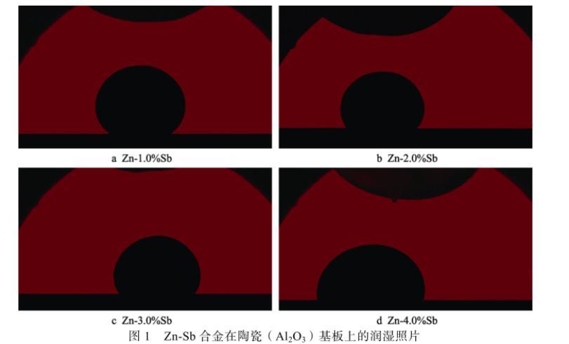 液態(tài)金屬表面張力是一個極為重要的物理化學性質,在液態(tài)金屬成形加工過程中,表面張力與金屬的流動性及其與金屬基板間的潤濕性密切相關。由于合金熔體與陶瓷的不潤濕性,可以通過計算得到較準確的合金熔體表面張力,并進行不同Zn-Sb合金熔體在陶瓷(Al2O3)基板上的潤濕實驗,圖1為實驗條件下不同Zn-Sb合金熔體在陶瓷基板上的潤濕照片。