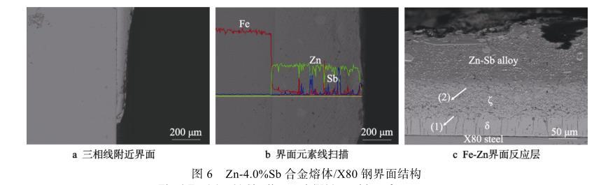 圖6c展示了經硝酸酒精腐蝕后,Zn-Sb合金與X80鋼潤濕的界面反應產物層。利用EDS沿界面進行定量檢測,發(fā)現界面處存在一定量的Zn、Fe和極少量的Sb,Zn-Sb合金熔體與X80鋼發(fā)生反應生成了鐵鋅化合物。能譜分析表明,圖6c中箭頭所示(1)、(2)處的含鐵量分別為8.30%和5.23%,為典型的δ(FeZn10)相和ζ(FeZn13)相,ζ層緊鄰Zn-Sb合金熔體,而δ層呈柵狀,位于ζ層的下方,這與徐其林等的研究結果一致。同時發(fā)現,隨著Sb含量的增加,潤濕反應所形成的界面產物層并未發(fā)生顯著變化,說明Sb元素的添加對Fe-Zn反應基本沒有影響。