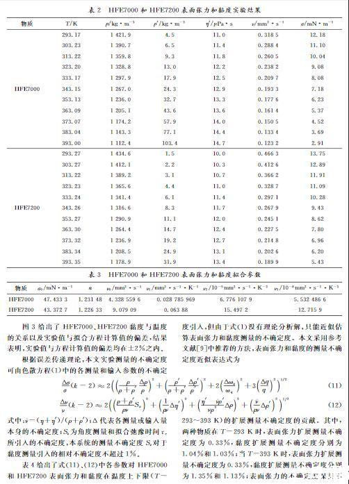 表4給出了式(11)、(12)中各參數(shù)對(duì)HFE7000和HFE7200表面張力和黏度在溫度上下限(T=293~393 K)的擴(kuò)展測(cè)量不確定度的貢獻(xiàn)。其中,兩種物質(zhì)在T=293 K時(shí),表面張力擴(kuò)展測(cè)量不確定度為0.33%,黏度擴(kuò)展測(cè)量不確定度分別為1.04%和1.03%;當(dāng)T=393 K時(shí),表面張力擴(kuò)展測(cè)量不確定度為0.33%,黏度擴(kuò)展測(cè)量不確定度分別為1.35%和1.13%;表面張力的不確定度保持不變,隨著溫度的升高,黏度測(cè)量的擴(kuò)展測(cè)量不確定度升高。越接近臨界溫度,氣相密度和黏度對(duì)擴(kuò)展測(cè)量不確定度的貢獻(xiàn)越大。因此,本文HFE7000和HFE7200表面張力的擴(kuò)展測(cè)量不確定度(置信因子k=2)估計(jì)為0.35%,黏度的擴(kuò)展測(cè)量不確定度(k=2)分別估計(jì)為1.35%和1.13%。