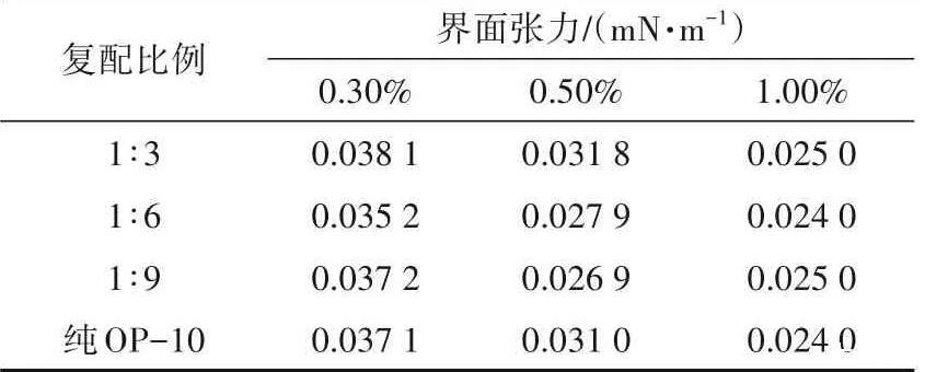 將HPAM配制成質(zhì)量分數(shù)為0.10%的水溶液,與不同濃度的OP-10按不同比例復(fù)配,并測定不同復(fù)配體系的界面活性,結(jié)果見表3。