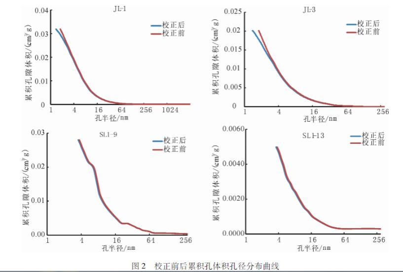 應(yīng)用參數(shù)校正前后的Washburn方程對(duì)松遼盆地青山口組JL-1、JL-3、SL1-9、SL1-13井的泥頁(yè)巖樣品壓汞數(shù)據(jù)處理得到累積孔體積的孔半徑分布曲線,分析發(fā)現(xiàn):參數(shù)校正后的方程對(duì)于微小孔的影響較大,在孔半徑小于4 nm時(shí),校正前后的兩條曲線出現(xiàn)明顯的不重合(圖2)。