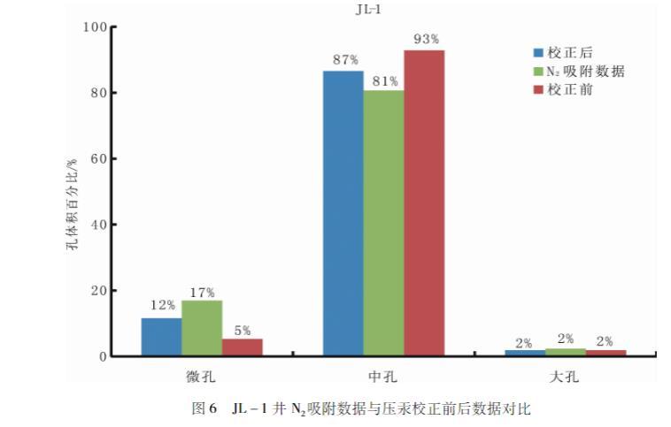用參數(shù)校正后的方程處理數(shù)據(jù)發(fā)現(xiàn)樣品微孔孔體積占比增加,較原始方程處理得到的結(jié)果增加了118%;而中孔孔體積占比減小,較原始方程處理得到的結(jié)果減小了7%;大孔孔體積占比不變。用改進(jìn)后的Washburn方程對(duì)松遼盆地青山口組JL-1、JL-3、SL1-9、SL1-13井的泥頁(yè)巖樣品的數(shù)據(jù)處理得出:該地區(qū)主要以微孔、中孔為主,發(fā)育有小部分大孔。統(tǒng)計(jì)壓汞實(shí)驗(yàn)數(shù)據(jù)發(fā)現(xiàn)微孔占比平均12%左右,中孔占比平均為86%,大孔占比平均為2%。依據(jù)實(shí)驗(yàn)數(shù)據(jù)評(píng)估,松遼盆地青山口組地區(qū)油氣主要儲(chǔ)集在中孔里面。因此,提高微小孔(<50 nm)烴源巖儲(chǔ)集層的勘探開發(fā)有十分重要的意義。