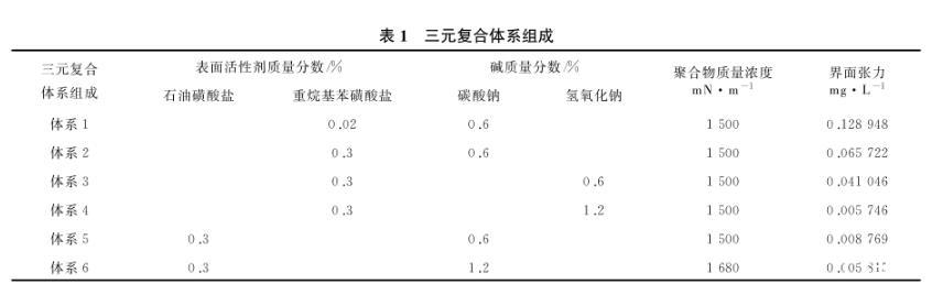 (4)實(shí)驗(yàn)用三元復(fù)合體系的組成見(jiàn)表1,界面張力分布在3個(gè)數(shù)量級(jí)。