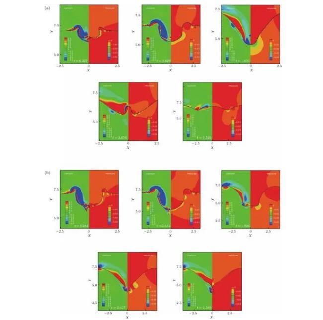 圖9不同時間節(jié)點下水滴撞擊深水液池空腔運動的渦量場和壓力場等值線圖