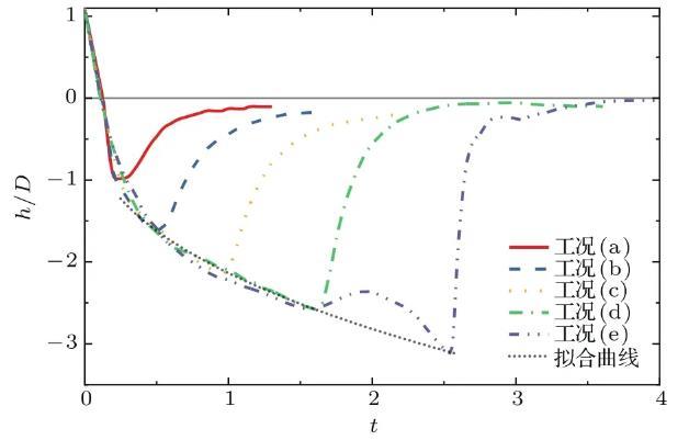 圖6為不同工況下空腔深度h隨時間的變化過程。由圖6可以看出,液滴撞擊深水液池后,由于動能、空腔側(cè)壁隆起部分重力勢能以及表面張力能的驅(qū)動,空腔深度先以較快速度增長,其后增勢逐漸放緩,在到達最大空腔深度后快速回彈,至接近原自由液面后回彈速度逐漸放緩,近乎趨于直線。弗勞德數(shù)的增加對空腔深度變化影響顯著,在工況(a)中,弗勞德數(shù)僅為117.2,空腔能量耗散時程較短,回復(fù)較為迅速,隨著弗勞德數(shù)的增大,撞擊動能增大,回復(fù)時程也逐漸增加。值得注意的是,在工況(e)中,由于空腔形狀由U形轉(zhuǎn)變?yōu)榻铺菪危涨辉趖=1.5—2.6時先緩慢上升,隨后毛細波向空腔底部傳遞,促使其底部變?yōu)閳A柱形,且深度繼續(xù)增加,最后空腔底部側(cè)壁坍塌形成射流,因此在t=2.6后空腔回復(fù)速度較其他工況更為迅速。將數(shù)值結(jié)果運用最小二乘法擬合,得到的擬合曲線表達式如(8)式所示,該式能夠在忽略毛細波運動的前提下,在空腔深度為h=D至達到最大深度的范圍內(nèi)較好地描述了空腔深度隨時間的成長關(guān)系,Liow等與Ray等對液滴撞擊運動中時間與空腔深度的關(guān)系進行了建模,得出與本文相似的結(jié)論:
