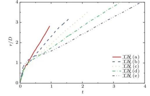 圖7及圖8分別為不同工況下波浪隆起高度hw和空腔寬度r隨時間的變化過程。由圖7易得,水滴撞擊水池后波浪高度的變化過程也經(jīng)歷了從快速增長到逐漸回落,最終在慣性力的作用下自主運動,趨于穩(wěn)定的過程。隨著弗勞德數(shù)的增大,更大的垂向速度在創(chuàng)造更深空腔的同時激發(fā)了更高的最大波浪隆起高度。從圖8可以看出,空腔寬度的增長與波浪的運動息息相關(guān),在撞擊產(chǎn)生的動能與波浪自身重力勢能基本耗散后,空腔運動主要由毛細波及其干擾驅(qū)動,最后在慣性下線性增長。毛細波現(xiàn)象在圖8工況(e)的t=0.8時非常顯著,其周期在圖6的t=1.5—2.5中也有體現(xiàn)。