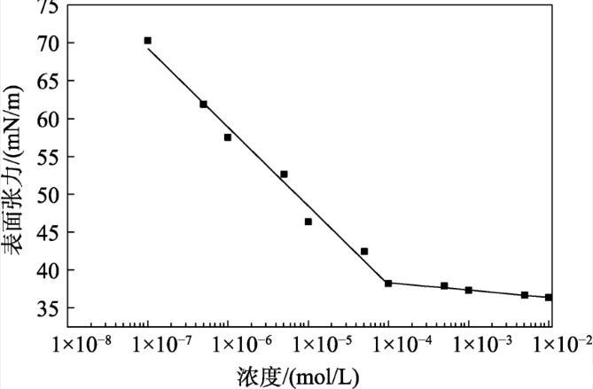 配制不同濃度TAC水溶液,測定溫度298.15 K,繪制溶液的表面張力隨濃度的變化曲線。在某一濃度前后,表面張力-濃度曲線會形成兩條斜率不同的直線,這兩條直線的交點(diǎn)即為臨界膠束濃度(CMC)。