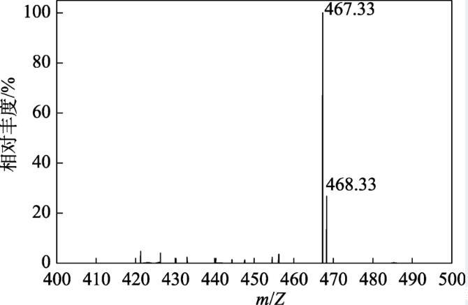 圖4為TAC的MS譜圖。從圖4可以看出,在正離子檢測模式下檢測到最大豐度的質(zhì)譜信號為m/Z=467.33,m/Z=468.33為[M+1],即正峰MS信號。TAC相對分子質(zhì)量測量值與計算值一致。