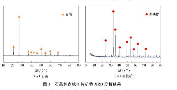 由表1可知,石英純礦物樣品中SiO2含量為98.37%,樣品中含有少量Al、Mg及其他微量元素,因此石英樣品可視為純礦物,滿足試驗(yàn)要求。由表2可知,赤鐵礦中TFe含量為68.24%,樣品中含有少量Si及其他微量元素,雜質(zhì)含量較少,因而赤鐵礦樣品可視為純礦物。