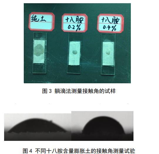 目前測量粉體接觸角(包括土顆粒)的方法主要有3種:躺滴法、毛細(xì)管上升法和Wilhelmy平板法,其中,躺滴法測出的接觸角為介于前進(jìn)接觸角和后退接觸角之間的表觀接觸角,毛細(xì)管上升法測出的接觸角為前進(jìn)接觸角,Wilhelmy平板法測出的接觸角為前進(jìn)接觸角或后退接觸角。土體開裂是一個(gè)相對較慢的過程,因此土顆粒與孔隙水的接觸角大部分時(shí)間應(yīng)該處于前進(jìn)接觸和后退接觸角之間的某一表觀接觸角。所以,本文采用躺滴法對土顆粒接觸角進(jìn)行測量。土樣烘干后過0.075 mm的篩,取長度為4 cm左右的雙面膠帶貼到載玻片上,將篩好的土顆粒均勻覆蓋載玻片,并用重量為200 g的砝碼壓住載玻片,持續(xù)時(shí)間為2 min,移開砝碼后反復(fù)輕輕磕碰載玻片以去除多余的土顆粒,直到膠帶表面覆蓋有一層薄薄的土顆粒,且土顆粒分布均勻無明顯凸起。如圖3所示,當(dāng)水滴滴到被純土覆蓋的膠帶上時(shí),液滴迅速擴(kuò)散開,此時(shí)土顆粒的親水性很好,接觸角趨近于0。水滴滴到另外兩個(gè)覆蓋著混有十八胺土樣的載玻片時(shí),形成了小液滴,此時(shí)固–液界面和氣–液界面之間的夾角不為0,把這2塊載玻片分別放到試驗(yàn)臺上進(jìn)行液滴在土顆粒表面的表觀接觸角測量,液滴初始體積為5μL,測量儀器為JC2000型接觸角測量儀,如圖4所示,每個(gè)土樣的接觸角反復(fù)測量5次后取平均值。十八胺含量為0.2%土樣的接觸角為30.5°,十八胺含量為0.4%土樣的接觸角為60.2°。