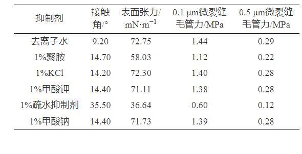 同時(shí)從表1中可以看出,疏水抑制劑能夠有效降低溶液的表面張力,當(dāng)微裂縫的寬度為0.1μm時(shí),微裂縫對(duì)于去離子水的毛管自吸力達(dá)到1.44 MPa,而加入疏水抑制劑后可以降低至0.60 MPa,而且隨著微裂縫寬度增加毛管自吸力逐漸降低。納米級(jí)別的微裂縫具有較高毛管自吸力,所以在體系構(gòu)建時(shí)應(yīng)封隔頁(yè)巖微納米級(jí)裂縫和加入疏水類的處理劑,弱化微納米級(jí)裂縫的毛管自吸力。