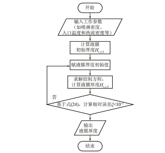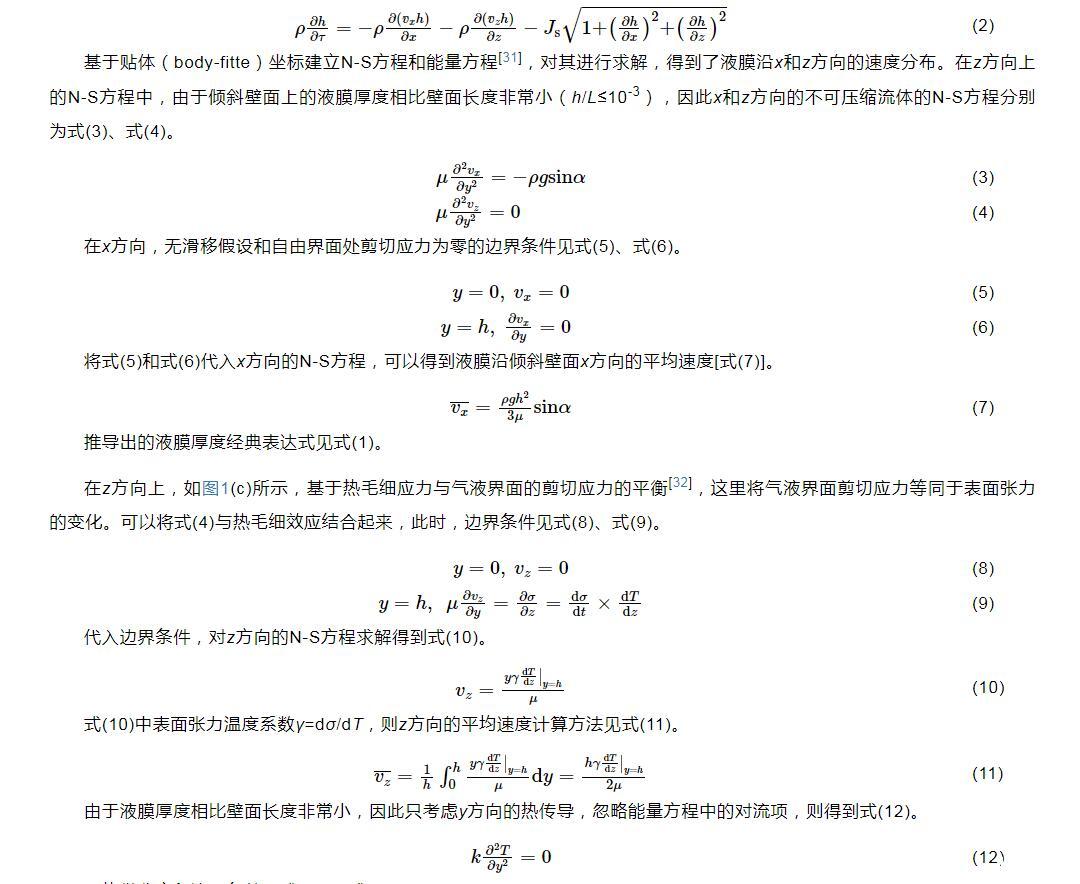 式(1)將作為本文模型計算的迭代初值。之后,Kapitza首次對傾斜平板上流動液膜的流體動力學(xué)不穩(wěn)定性進行了研究,對流動液膜的流動不穩(wěn)定性和破裂有了初步的認識。隨著實驗方法和測量技術(shù)的不斷進步,研究人員通過更高效的實驗和模擬方法對流動液膜進行了深入和廣泛的研究,深化了對液膜流動模式、流動特性和蒸發(fā)等內(nèi)在機制的理解,也為相關(guān)的工業(yè)應(yīng)用提供了重要的科學(xué)依據(jù)。