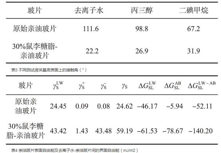 表3不同測(cè)試液體基底表面上的接觸角(°)