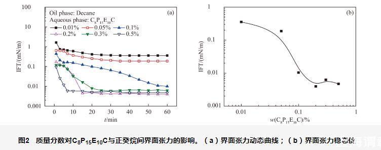 圖2質(zhì)量分數(shù)對C8P15E10C與正癸烷間界面張力的影響。(a)界面張力動態(tài)曲線;(b)界面張力穩(wěn)態(tài)值