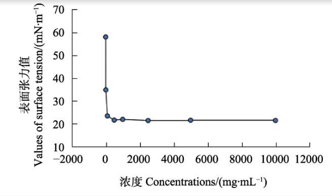 按國家標(biāo)準(zhǔn)GB 5549—2010的方法,將助劑380配置成1、10、100、1000、10 000、100 000 mg/mL系列濃度,用表面張力儀測定相應(yīng)濃度藥液的表面張力。以濃度和其對(duì)應(yīng)的表面張力值分別為橫縱坐標(biāo)作圖,獲得一條曲線,曲線拐點(diǎn)對(duì)應(yīng)的濃度即為助劑380的臨界膠束濃度。