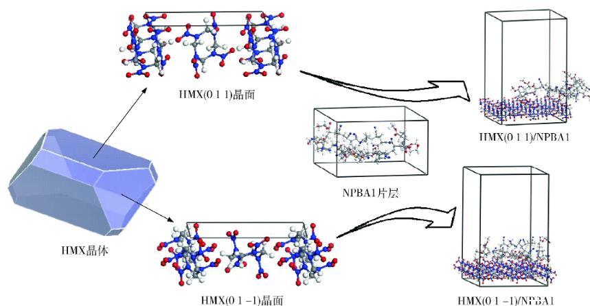 由于實(shí)際HMX以晶體的形式存在,因此在建立HMX吸附NPBA界面模型時(shí),首先根據(jù)β-HMX的晶體衍射數(shù)據(jù),構(gòu)建HMX初始晶胞,模擬HMX的晶體形貌,確定HMX晶體的主要晶面后,擴(kuò)建超晶面;然后,建立包含1條分子鏈的NPBA片層模型,將超晶面與片層模型復(fù)合,構(gòu)建HMX吸附NPBA的6個(gè)界面模型,具體細(xì)節(jié)如2.1.1節(jié)中所述。3種NPBA的分子結(jié)構(gòu)式及其模型見圖1,HMX超晶面、NPBA片層模型及界面模型見圖2,其余略。