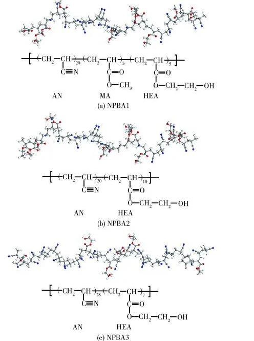 利用美國Accelrys公司Materials Studio軟件建立NPBA分子模型時(shí),NPBA1聚合單元AN、MA和HEA的數(shù)目分別為20、5和5,NPBA2聚合單元AN和HEA的數(shù)目分別為20和10,NPBA3聚合單元AN和HEA的數(shù)目分別為28和7,NPBA分子模型上各類聚合單元均為隨機(jī)分布。此時(shí)3種NPBA分子模型的摩爾鏈節(jié)比分別為4∶1∶1、2∶1和4∶1,且相對(duì)分子質(zhì)量均為2 300左右,使得所構(gòu)建的模型與實(shí)際物質(zhì)具有較好的對(duì)應(yīng)關(guān)系。