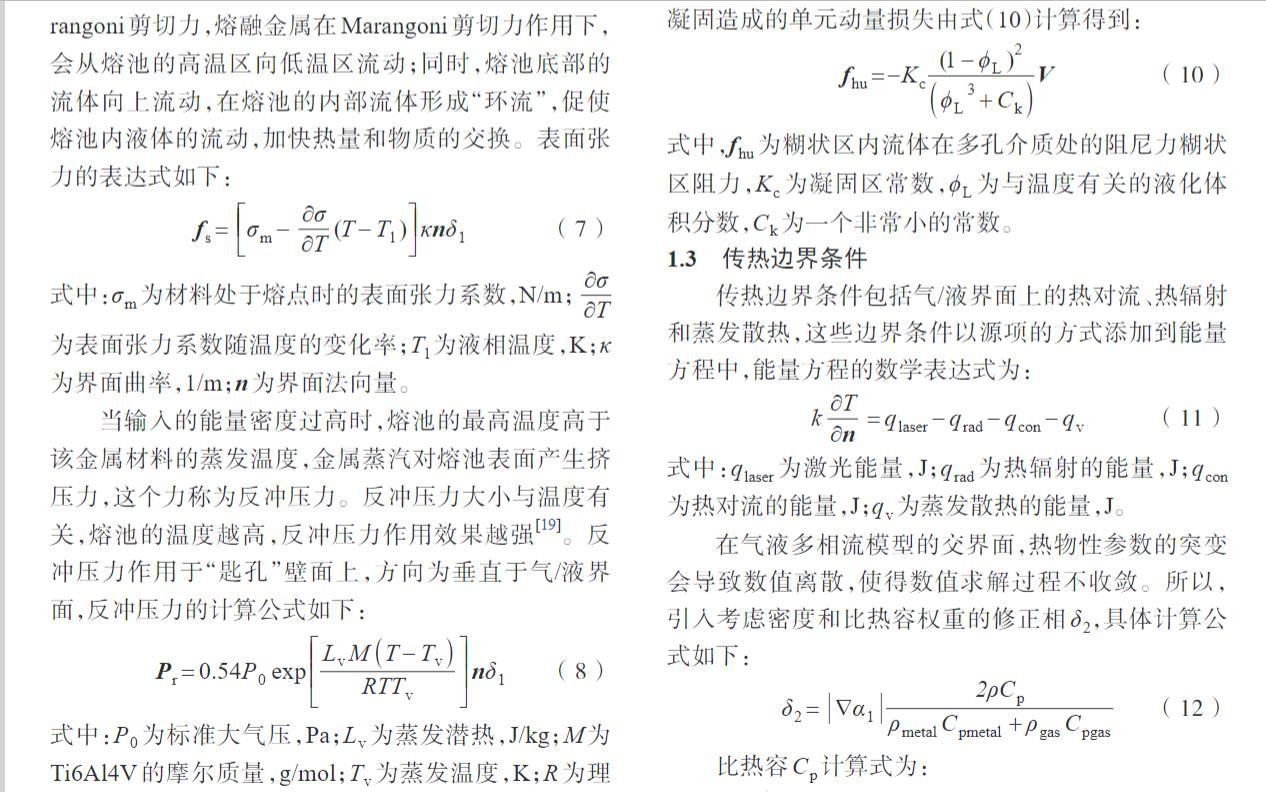 當(dāng)輸入的能量密度過高時(shí),熔池的最高溫度高于該金屬材料的蒸發(fā)溫度,金屬蒸汽對(duì)熔池表面產(chǎn)生擠壓力,這個(gè)力稱為反沖壓力。反沖壓力大小與溫度有關(guān),熔池的溫度越高,反沖壓力作用效果越強(qiáng)。反沖壓力作用于“匙孔”壁面上,方向?yàn)榇怪庇跉?液界面,反沖壓力的計(jì)算公式如下: