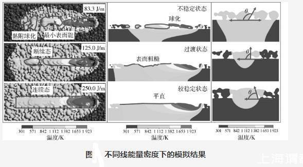 為分析線能量密度對(duì)球化缺陷形成機(jī)理的影響,選取激光功率150 W,線能量密度分別為83.3 J/m、125.0 J/m和250.0 J/m的3組參數(shù)進(jìn)行數(shù)值模擬,結(jié)果如圖2所示。當(dāng)線能量密度為83.3 J/m時(shí),部分熔融金屬凝固并與周圍粉末黏附成球;部分熔融金屬在表面張力的驅(qū)使下傾向于減少表面能,迅速地成球;這兩種成球方式往往共同出現(xiàn)。這是因?yàn)榧す獾拇┩干疃葲]有到達(dá)基板,此時(shí)接觸角為180°,呈現(xiàn)不完全濕潤狀態(tài),液態(tài)金屬流動(dòng)受阻,因此不能在基板上鋪展。當(dāng)線能量密度提高到125.0 J/m時(shí),單道由球化形態(tài)向斷續(xù)態(tài)過渡,雖然表面還比較粗糙,但是球化效應(yīng)明顯減弱,此時(shí)激光穿透深度剛剛到達(dá)基板,接觸角約為90°。當(dāng)線能量密度繼續(xù)提高到250.0 J/m時(shí),熔化的金屬粉末形成充足的熔融金屬,從而改善其流動(dòng)性,凝固后獲得高度均勻和連續(xù)的單道,激光穿透深度能夠穿透粉末床并熔化基板,并且接觸角大于90°。因此,球化缺陷的形成機(jī)理可以總結(jié)為能量密度太低,熔融金屬不能在基板上鋪展。判斷是否球化最直接的依據(jù)是觀察熔池深度是否穿透粉末層厚,并熔化了基板,也可以計(jì)算熔池的接觸角是否小于90°來判斷熔池的濕潤性。此外,還可通過適當(dāng)提高線能量密度,提高熔融金屬的流動(dòng)性,以獲得更均勻和連續(xù)的單道。