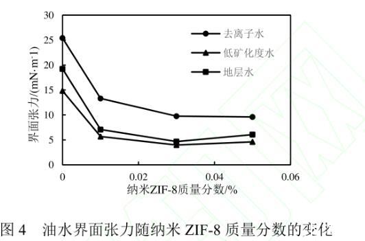 納米ZIF-8流體的穩(wěn)定性是評價其能否作為驅(qū)油劑的重要性質(zhì)之一。將裝有不同濃度納米流體的樣品瓶靜置15 d后,當(dāng)ZIF-8的質(zhì)量分?jǐn)?shù)為0.01%、0.03%時,納米顆粒在不同礦化度的流體中均保持穩(wěn)定狀態(tài),無沉淀生成,說明適當(dāng)濃度的納米ZIF-8顆粒在水中有著良好的穩(wěn)定性。當(dāng)ZIF-8的質(zhì)量分?jǐn)?shù)為0.05%時,靜置后的納米流體產(chǎn)生了少量沉淀,表明過高濃度的ZIF-8會互相聚結(jié),導(dǎo)致顆粒變大,進(jìn)而發(fā)生聚沉。