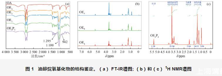 圖1油醇烷氧基化物的結(jié)構(gòu)鑒定。(a)FT-IR譜圖;(b)和(c)1H NMR譜圖