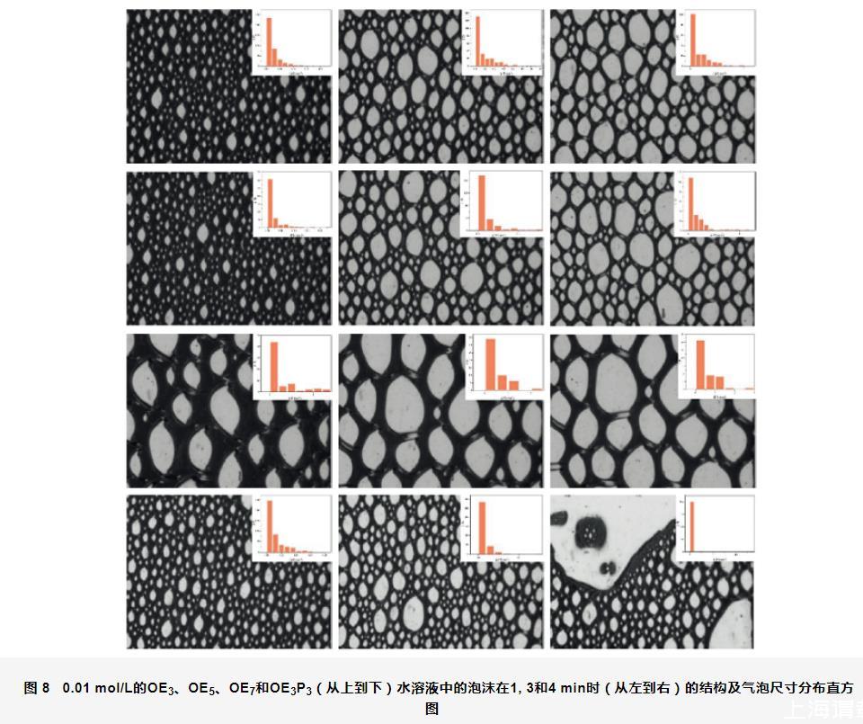 圖8 0.01 mol/L的OE3、OE5、OE7和OE3P3(從上到下)水溶液中的泡沫在1,3和4 min時(shí)(從左到右)的結(jié)構(gòu)及氣泡尺寸分布直方圖