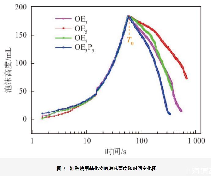 起泡性和穩(wěn)泡性是表面活性劑泡沫性的兩個(gè)非常重要的特征。圖7是0.01 mol/L油醇烷氧基化物水溶液在氣體流量為150 L/min時(shí)測(cè)量的泡沫衰減曲線(xiàn)。圖中的T0為停止通氣時(shí)間,可用此時(shí)的泡沫高度表示表面活性劑的起泡性,此后泡沫開(kāi)始排液并發(fā)生衰減。從圖中可以看出,4種油醇烷氧基化物在60 s時(shí)的泡沫高度基本都為183 mm,說(shuō)明4種烷氧基化物的起泡性基本一致。在停止通氣后,油醇烷氧基化物的泡沫高度迅速降低,并沒(méi)有經(jīng)過(guò)一個(gè)泡沫高度維持不變的時(shí)間段,說(shuō)明此時(shí)泡沫不僅開(kāi)始排液并且發(fā)生了坍塌,油醇烷氧基化物的泡沫不穩(wěn)定。從圖中還可以看出,OEn中泡沫衰減速度為:OE3>OE7>OE5,在255 s后,OE3和OE7的泡沫衰減速度幾乎一致。而OE3P3的泡沫衰減速度最快,這可能是因?yàn)镻O的支化結(jié)構(gòu)使得液膜的強(qiáng)度較差所致。