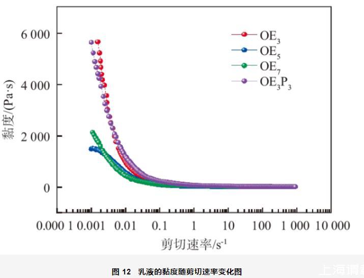 4)以4種油醇烷氧基化物為乳化劑制備的乳液都形成了層狀液晶,流變性測(cè)試結(jié)果表明4種乳液都屬于剪切變稀體系且加入OE3的乳液體系具有較好的穩(wěn)定性。