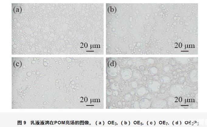 圖9乳液液滴在POM亮場(chǎng)的圖像。(a)OE3,(b)OE5,(c)OE7,(d)OE3P3
