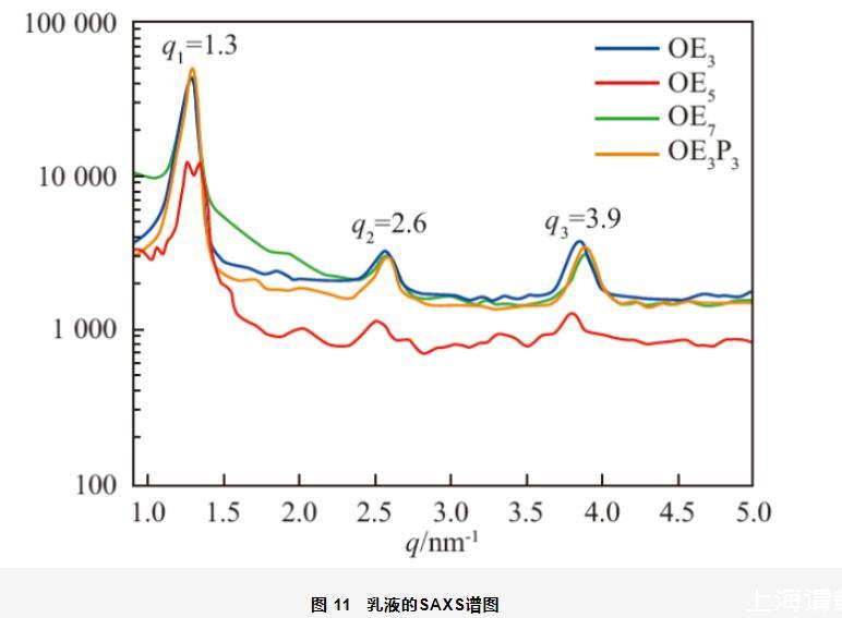 對(duì)乳液進(jìn)行了SAXS測(cè)試,結(jié)果如圖11所示。由圖可知,4種乳液的SAXS譜圖中都出現(xiàn)了3組衍射峰,且q1∶q2∶q3滿(mǎn)足1∶2∶3,進(jìn)一步證明了乳液的層狀液晶結(jié)構(gòu),q2處明顯的衍射峰表明液晶結(jié)構(gòu)的長(zhǎng)程有序,使乳液不容易發(fā)生結(jié)塊或絮凝等,起到穩(wěn)定乳液的作用。另外,以O(shè)E5為乳化劑制備的乳液的SAXS譜圖中出現(xiàn)了很多毛刺,說(shuō)明樣品的有序性較差。