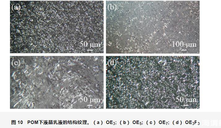 對(duì)制備的乳液在POM暗場(chǎng)進(jìn)行了觀(guān)察,液晶乳液的結(jié)構(gòu)紋理圖如圖10所示。由圖10可知,隨著OEn中EO加合數(shù)的增加,乳液液晶結(jié)構(gòu)的紋理由“馬耳他十字”花紋向纖維狀轉(zhuǎn)變;當(dāng)在OE3中引入PO基團(tuán)后,乳液液晶結(jié)構(gòu)的紋理依然呈“馬耳他十字”花紋狀。但對(duì)比圖10(a)和(d)發(fā)現(xiàn),以O(shè)E3P3作為乳化劑形成的液晶結(jié)構(gòu)尺寸要大于以O(shè)E3為乳化劑形成的液晶。“馬耳他十字”花紋和纖維狀液晶結(jié)構(gòu)紋理說(shuō)明4種乳液中都存在著層狀液晶。