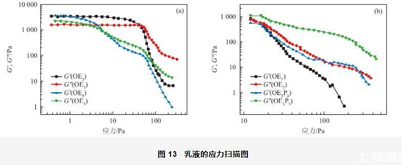 4種乳液的應(yīng)力掃描結(jié)果如圖13所示。從圖13(a)中可以看出,以O(shè)E3和OE5為乳化劑制備的乳液存在線(xiàn)性黏彈區(qū),當(dāng)應(yīng)力低于屈服應(yīng)力時(shí),乳液的彈性模量(G')大于黏性模量(G''),表明乳液主要以不穩(wěn)定的彈性形式存在,乳液的不穩(wěn)定性主要與大量的水和液體石蠟有關(guān);當(dāng)應(yīng)力大于屈服應(yīng)力時(shí),G'和G''都開(kāi)始降低,說(shuō)明乳液內(nèi)部的微觀(guān)結(jié)構(gòu)發(fā)生了一定程度的破壞。從圖13(a)還可發(fā)現(xiàn),以O(shè)E3為乳化劑制備的乳液比以O(shè)E5為乳化劑制備的乳液的線(xiàn)性黏彈區(qū)寬,說(shuō)明前者乳液的穩(wěn)定性較強(qiáng),體系不容易沉降或者分層。從圖13(b)中可以看出,以O(shè)E7和OE3P3為乳化劑制備的乳液在測(cè)定的應(yīng)力范圍內(nèi)不存在線(xiàn)性黏彈區(qū),當(dāng)應(yīng)力接近10 Pa時(shí),兩種溶液的G'和G''就開(kāi)始降低,即乳液結(jié)構(gòu)遭到了破壞。根據(jù)應(yīng)力掃描結(jié)果發(fā)現(xiàn),以O(shè)E3為乳化劑制備的乳液的穩(wěn)定性明顯強(qiáng)于其它3種乳液,這可能是因?yàn)椋?dāng)分別以O(shè)E5、OE7和OE3P3為乳化劑時(shí),由于其分子結(jié)構(gòu)中長(zhǎng)的、卷曲的EO鏈和支化的PO鏈在液滴表面形成的界面層不夠穩(wěn)定所致。