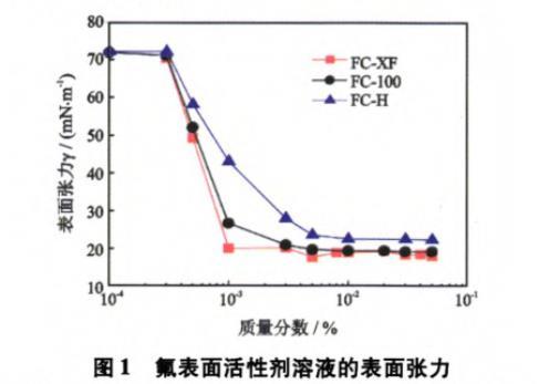 本研究的目的是獲得具有低表/界面張力且與巖石達到近似于中性潤濕的助排劑。首先,需要選擇表面活性劑。表面活性劑溶液達到臨界膠束濃度(cmc)后的表面張力(γcmc)是該表面活性劑溶液能夠獲得的最低表面張力。根據(jù)常見表面活性劑的γcmc數(shù)據(jù),氟表面活性劑能夠使水溶液達到更低的表面張力。因此,在新型助排劑中將選用合適的氟表面活性劑以降低溶液的表面張力。其次,選擇潤濕性改變劑。要達到與巖石接近中性潤濕,需要調(diào)節(jié)助排劑在巖石表面的吸附作用,以改變巖石表面的性質(zhì)使助排劑體系與巖石潤濕接觸角在75°~105°間(90°±15°)。此外,由于氟表面活性劑和潤濕性改變劑一般只能使油水界面張力降低到1 mN/m以上,因此要借鑒化學(xué)驅(qū)提高采收率中能夠與原油達到超低界面張力的表面活性劑的選擇方法,復(fù)配合適的碳氫表面活性劑以獲得能夠同時降低界面張力的助排劑體系。