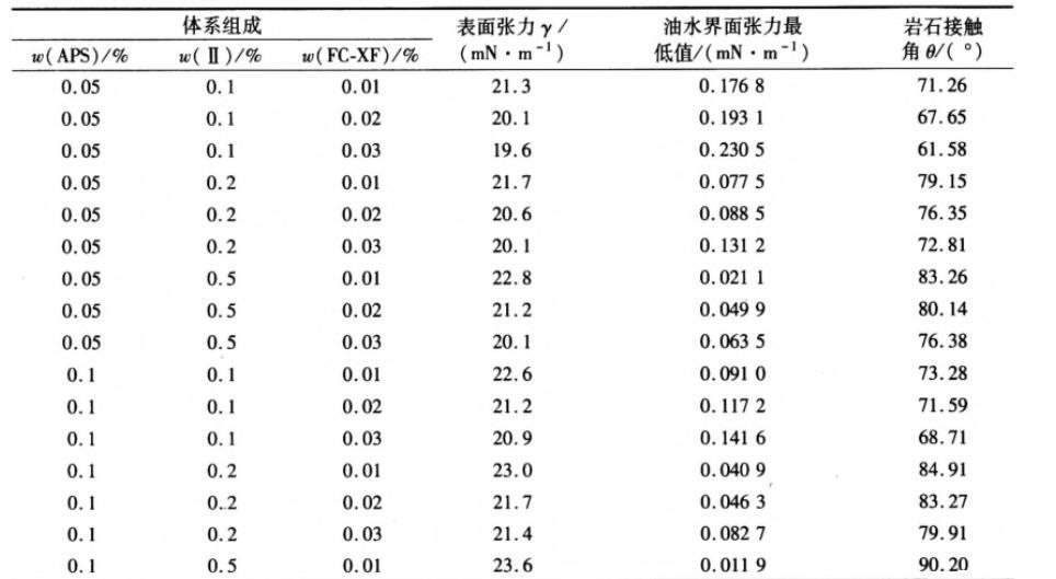 從圖4和圖5中也可以看出,當Ⅱ型潤濕劑質(zhì)量分數(shù)為0.2%、APS質(zhì)量分數(shù)在0.05%~0.20%之間、FC-XF質(zhì)量分數(shù)在0.01%~0.03%之間時混合體系具有更高的界面活性。因此,選擇APS質(zhì)量分數(shù)為0.05%、0.10%和0.20%,Ⅱ型潤濕劑質(zhì)量分數(shù)為0.1%、0.2%和0.5%,F(xiàn)C-XF質(zhì)量分數(shù)為0.01%、0.02%和0.03%進行三因素三水平的正交實驗,考察APS/Ⅱ/FC-XF混合體系的界面性能及與巖石的接觸角,結果如表1所示。