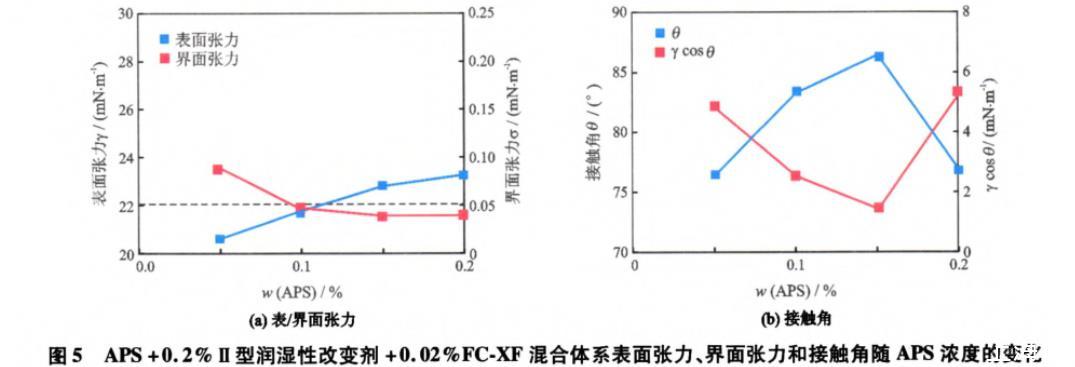從圖5(a)中可以看出,隨著APS質(zhì)量分數(shù)的增加,體系的表面張力增大,界面張力減小,這與FXCF對表/界面張力的影響機制相同。從圖5(b)中可以看出,隨著APS質(zhì)量分數(shù)的增加,體系與巖石的接觸角先增加再減小,相應的γcosθ先減小再增大,均出現(xiàn)極值點,這與圖4(b)的變化趨勢不同。這是因為吸附Ⅱ型潤濕性改變劑和FC-XF使得巖石表面由水濕轉(zhuǎn)變?yōu)槿跤H水性潤濕(接觸角<75°),更易于吸附APS的親水頭基而使碳氫鏈在巖石表面暴露,這降低了巖石表面的親水性,因而隨著APS質(zhì)量分數(shù)的增加接觸角增大。但是,當APS質(zhì)量分數(shù)大于0.15%后,過多的APS分子可能在巖石表面發(fā)生雙分子層吸附或因競爭吸附而降低Ⅱ型潤濕性改變劑的吸附量,使得巖石表面的親水性增加。而且,接觸角的變化決定了γcosθ的變化趨勢,因而接觸角和γcosθ隨APS質(zhì)量分數(shù)的變化曲線中均出現(xiàn)極值點。