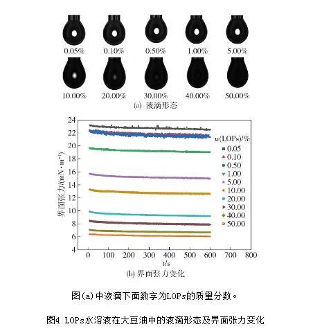 圖4 LOPs水溶液在大豆油中的液滴形態(tài)及界面張力變化