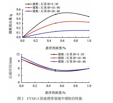 圖2為FYXF-3的濃度分別與出液時間、煤粉流出量的關系圖;圖3為煤粉:石英砂比例為5:95時的實驗現(xiàn)象圖。