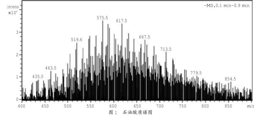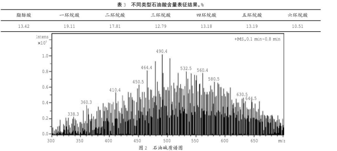 (1)萃出石油酸組分含量為3.88%,相對分子質(zhì)主要分布在400~900,碳數(shù)對應(yīng)C27~C62,結(jié)構(gòu)以環(huán)烷酸為主;