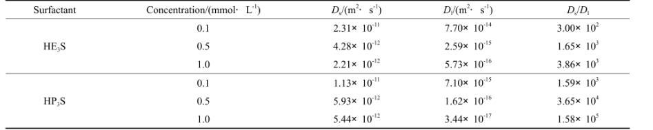 表2 HE3S和HP3S不同濃度水溶液的擴散系數(shù)及其比值