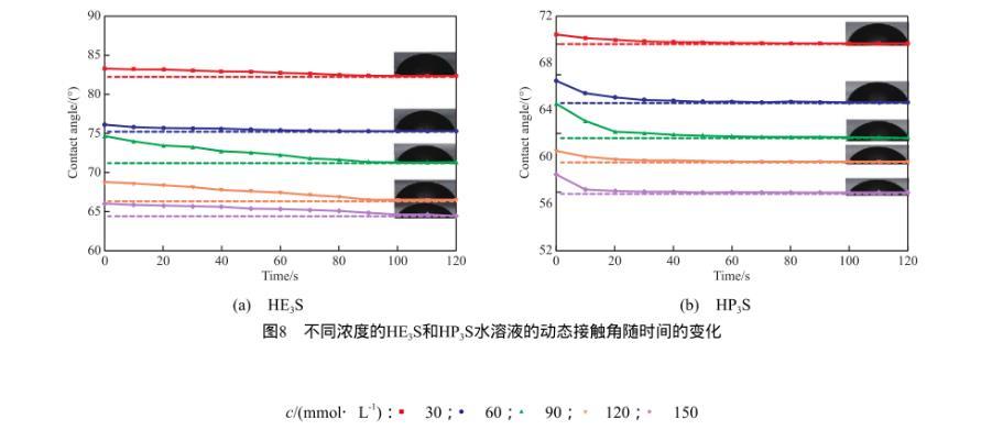 圖8不同濃度的HE3S和HP3S水溶液的動態(tài)接觸角隨時間的變化